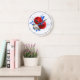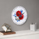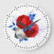 Den här väggklockan har en vacker blommigt arrangemang i rött, vitt och blått. Den finns i två storlekar i rund och fyrkantig