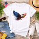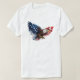 A striking side-profile illustration of a bald eagle mid-motion. With wings fully outstretched, the eagle surges forward in a commanding pose, its sharp golden eye, hooked yellow beak, and extended talons conveying strength, vigilance, and resolve. One wing is rendered in deep navy blue adorned with crisp white stars, while the other flows in bold red and white stripes, transforming the wings into a living embodiment of the American flag. Dynamic paint splashes and dripping accents in red, white, and blue radiate from the feathers, adding a modern, high-impact energy.
