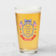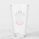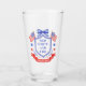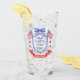This patriotic bridal shower glasses features a watercolor crest with a light red white and blue patriotic crest with American flags and a blue bow. Text in the center of the crest says "Red, white and I do." You can personalize with your event date.
