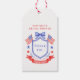 This patriotic bridal shower gift tag design features a watercolor crest with a light red white and blue patriotic crest with American flags and a blue bow. You can personalize with your event details.