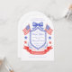 This patriotic bridal shower invitation features a watercolor crest with a light red white and blue patriotic crest with American flags and a blue bow. You can personalize with your event details.
