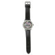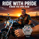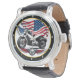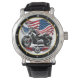 This distinctive watch face features a prominent American flag waving in the background, behind a detailed black motorcycle. Large, stylized wings extend from the motorcycle's side, with additional red and blue feathered wings at the bottom. The overall design emphasizes patriotism and a love for motorcycling, with clear silver numbers and watch hands for timekeeping.