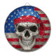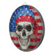Patriotic Skull bär en bandanna i pulserande röda, vita och blå nyanser framför den amerikanska Flagga som symboliserar den amerikanska andan.