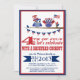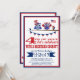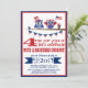 Illustrationer av två patriotiska uggla i rött, vitt och blått med en amerikansk flagga och top hat. Den lustiga 4:e juli-festinbjudan är en söt och unik inbjudan till ge till din familj och dina vänner.