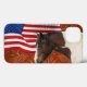 En stilig indiansk Paint Horse står framför den amerikanska Flagga med en western, utslitad läderklädd bakgrund, en ge och äkta western känsla för denna patriotiska design. Bara perfekt för dem som kör kärlek och USA! Skye Ryan-Evans ©.