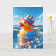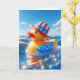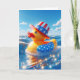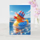 En livfull gul gummianka med en hatt med det amerikanska flaggan mönster flyter på det gnistrande blå vattnet i en ocean för 4 juli