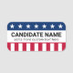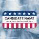 Namn bricka med vita stjärnor på blå bakgrund överst och röd och vit rand vid grund. Mall fält för anpassningsbar kandidat namn och en rad ytterligare text. Fyll i namn på er favoritpolitiska kandidat.
