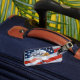 Patriotisk bagagemärkre med slut upp fotoet av örnen som läggas över över amerikanska flaggan