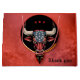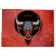 Patriotisk tjur, en amerikansk tjur. En stiliserad bull som verkar kraftfull och dynamisk. Tjuren är till övervägande del ett pulserande rött som symboliserar styrka och energi. Dess horn är vita, skapar en slående kontrast och teckning uppmärksammar huvudet. Tjurens ansikte är mörk och skäggig, med accenter för gult som belyser detaljer och lägger till djup i bilden. På tjurfäktningen finns en amerikansk flagga mönster, som betonar den nationella tillhörigheten. Mönster är underbart detaljerat beskrivet och ge är en patriotisk beröring.