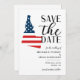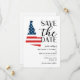 Patriotisk Idaho-destinationsbröllop spara datumet med en amerikansk stat och flaggillustration.