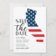 Patriotiskt Kalifornien destination bröllop spara datum med en statlig illustration och USA:s flagga.