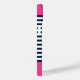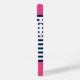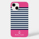 Personalize this cute Navy and White Striped Nautical Print Phone Case with your name on a Pink Background. The design features a modern white script typography on a pink background. The example is for an iPhone 14 model, but it will fit other models on Zazzle. Please verify before purchasing.