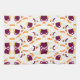 Patterned design with purple cats, yellow fish skeletons, and orange leaves. The playful, whimsical print shown in horizontal and vertical formats.