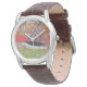 Segelbåten presenteras med en burgundsmönstrad segel, ett blandat mediaarbete av konst, när den seglar över havets vatten av röd och blek grönt med grumlig himmel som rullar in i bakgrunden.