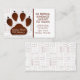 Business cards with your business name, brown paw print, woof art and custom text for adding hours open, message and all text fully customizable to suit your own pet lover business.