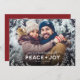 Prisvärda anpassningsbar tryckte ut julfotokort med enkla mallar för anpassning. Den här snyggten har en enkel fotoöverläggningsdesign med ett gräns av botaniskt grenar, löv och vingar. Hälsning säger att ditt hjärta kan fyllas med fred + glädje i en modern typografi. Anpassa den med din bild, namn, årstext eller annan anpassningsbar. Omvänd sida har plats för ytterligare foton eller text. Använda designen verktyg för att redigera texten typsnitt och färg, lägga till fler foton och skapa en unik julfotokortsdesign.