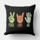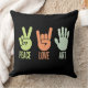 Detta djärva och moderna dekorativ kudde har tre symboler: fredsteckenet, handgesten i kärlek och ett öppet handflatan som symboliserar konst. Med mjuka pastelltoner av grönt, orange och grädde mot svart bakgrund ger denna design ett enkelt men kraftfullt budskap: Fred, Kärlek, konst Perfekt för konstnärer, kreativ och fri sprit som vill ge positiv och inspiration till sitt område. En snyggt för studior, rum eller vardagsrum och en tänkbar gåva till konstentusiaster.