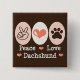 Visa kärlek för din favoritras av hund med vår söta rosa- och mörk-bruna fredssymbol, hjärt- och tassdesign med ord Peace Kärlek Dachshund på t-shirts, T-tröjor, kläder och fler hund älskare-presenter för hela familjen. Klicka här om du vill se hela vårt söta och originella Chrissy H.