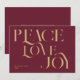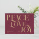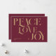 Elegant julkort med chic-typografi, fred i kärlek glädje i guld färg och burgundröd bakgrund.