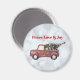 En helgdag magnet med en söt julklapp. Texten säger: Fred Kärlek & Joy. Bilden är en söt liten liten leksak lastbil med God jul-hand som målats på sidan med guld. Att bära en dekorerad Julgran i ryggen. Bakgrunden är ett silver-bäckenet mönster.