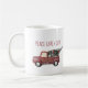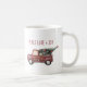 Ett mugg med en bild av ett sött litet leksak lastbil med God jul på sidan. Att bära en dekorerad Julgran i ryggen. Texten säger: Fred Kärlek & Joy.