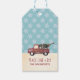 En söt julklapp märkre. Anpassa med ditt namn. Texten säger: Fred Kärlek & Joy. Bilden är en söt liten leksak lastbil i rött med God jul hand som målats i guld på sidan. Att bära en dekorerad Julgran i ryggen. Bakgrunden har en blå och vit snöflinga mönster.