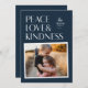 Vårt helgdag Peace-kort Kärlek och Kindness är perfekt för att skicka ett glädjande budskap till vänner och familj i julas. Framsidan har ett fet blått färg med ett unikt meddelande och ett enda foto. Baksidan är tom där du kan lägga till ytterligare foton eller ta med ett längre eget meddelande. Det finns gott om utrymme för din årliga jul brev!