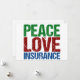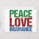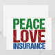 Ett snyggt julkort för försäkringsmäklare med gröna, röda och blå bokstäver som lyder Peace Love Insurance. Jättefina julkort till dina kollegor på försäkringsbolaget.
