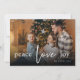 Detta fred kärlek glädje jul dubbelsidiga platta kort har modern skript typografi och 3 foto collage på baksidan. Infoga dina favoritfoton, lägg till en personlig touch med ditt eget hjärtliga meddelande och anpassa det efter eget tycke. Foton av prostooleh / Freepik.