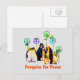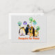 Cute penguins av alla former och storlekar håller fredstecken som är dekorerade med blommor när de marscherar i en protest mot fred. Texten säger "Penguins for Peace".