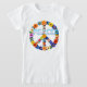 A colorful floral peace sign with the text PEACE prominently displayed in pale blue. A perfect T-shirt for any occasion, spreading PEACE to the world.