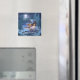 A peaceful scene in a snowy winter forest. A cozy cabin with warm light glowing in its windows, Christmas lights on its porch roof and a wreath on its door sits under a full moon surrounded by tall pine trees.