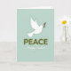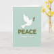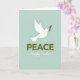 This design shows a white winged bird gliding mid-air against a muted aquamarine background, its curved wings spread as if lifting gently. A tiny dark eye and a small touch of red at the beak give it a tender, attentive look, like it’s bringing a note of care to someone special 🌷. From its beak hangs a small green sprig, adding a fresh accent that feels like a quiet gesture between friends. A faint shadow beneath the bird adds a little depth while keeping the overall look simple and airy. Centered below the bird, the word “PEACE” sits in large, all-capital serif letters colored earthy olive. Under that, a smaller seasonal greeting appears in white, set in flowing cursive and aligned neatly beneath the main word 🐇. The layout is balanced with lots of open space, and the olive text contrasts softly with the aquamarine field while the white lettering echoes the bird above. The bird’s wings angle upward, and the green sprig points slightly down toward the stacked lines of text.