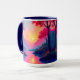 Bring a moment of profound peace and vibrant color to your morning coffee or evening tea ritual with this beautifully designed ceramic drinkware. This large mug features a wrap-around illustration of a breathtaking, serene fantasy landscape. The glowing sunset over a calm river, framed by rich magenta trees and distant mountains, provides a deeply relaxing visual start to your day. The spacious sky area serves as the perfect natural template for you to easily add a monogram, a motivational morning quote, or your name.