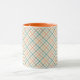 Start your day with a touch of style with this peach and teal plaid design coffee mug. The soft plaid pattern in warm peach tones and cool teal accents creates a contemporary look, perfect for adding a modern vibe to your kitchen or office. Whether you're sipping your morning coffee, tea, or any favorite beverage, this mug makes a charming addition to your collection. A wonderful gift or a personal treat, its unique design adds a sophisticated and stylish flair to every sip.