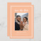 Modern, enkel Spara Datumfotot med ram-design har din favoritbild bild i förlovningen som är uppbyggd av ett skarpt vitt ram på en trendig persikobakgrund. Anpassa och din förlovning och bröllop-information med dina gäster i snyggt och skript. Utformningen kompletteras med en modern dubbla ram i vitt. Kortets baksida är en solid persika. Den här porträtt-konfigurationskonfigurationen (höjden är underbarare än bredden) fungerar utmärkt med nära foton och rektangulära längdfoton av fullt och din fantasi. Välj din favorit! Kontakta invitationsuites@gmail.com med frågor eller anpassningsbar färg förfrågningar.