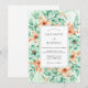 This design features a soft and romantic aesthetic, blending mint green foliage with warm peach blossoms. Delicate vines and petals create a fresh, seasonal atmosphere perfect for springtime. The color palette of pastel orange and seafoam green evokes a sense of breezy elegance. Peach blossoms are displayed alongside lush greenery.