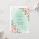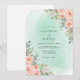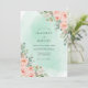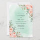 Delicate peach blossoms and lush greenery cascade across this design, evoking a soft and romantic mood. The watercolor wash background in a soothing mint hue adds a touch of serene elegance. This botanical arrangement is perfect for a classic, nature-inspired celebration.