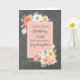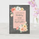 Söt och omtänksamt hälsningskort för din styvdotters födelsedag med persikofärgad rosa och vit vår blommor, rustik schalkboard mönster och handskriven text från stil.