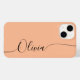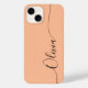 Persika Fuzz Elegant Black Calligraphy Script Anpassningsbar Personlig Namn iPhone 14 Smart Phone Case har en modern och enkel design för trendig och snyggt med din personlig namn i elegant-handskriven calligraphy-skripttypografi på en persikobakgrunden. Designad av ©Evco Studio www.zazzle.com/store/evcostudio