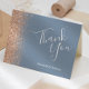 Den här eleganten är bröllop tack vare ditt kort en gräns av persikofaux glitter på en dammig blå bakgrund. Anpassadet kombinerar ord "Tack" med vitt handskriftsskript och namnen på briden och trippen med kursivt teckensnitt.