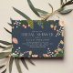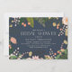 Chicens natur inspirerade inbjudningskort för möhippan har en gräns av rosa och persikoblommor med löv och botaniska ämnen i grönt. Anpassa med möhippa- och registerinformation i elegant, vit text på rik bläck blå bakgrund.