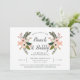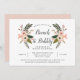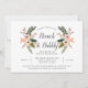 Chic inbjudningskort för möhippan har "brunch & bubly" i kalligrafiskript för elegant, framskridet av persikor och blommor, knoppar och gröna rosor. Anpassa med din möhippa brunch-information under.