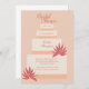 Inbjudningskort för möhippan har en vacker bröllop-kaka och blommor i terracotta, persikor och rosa. Kakan fylls med en "möhippa" kaka.