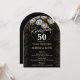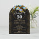 Elegant svart och guld 50:e bröllop-årsdagen av inbjudan med guld ring och fredsfjädrar, ändra hela texten till vilken årsdag som helst eller till tillfälle.
