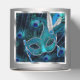 Peacock maskerad-festens favoritruta. Vackert silver och royal blå maskerad partyt med vacker blå luddmask på en elegant blå fjäderbakgrund.