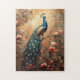 En graciös målning och elegant med en stor fredsbock försedd med iridescentblått och grönt fjädrar, som på ett utmärkt sätt konfronteras med ömtåligt rosa ros. De stora massaskaderna i påsen är mycket detaljerade, de skakar med guld och teal, medan det mjuka, romantiska ro väver genom scenen och lägger till en aning vintage charm.