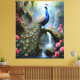 A majestic peacock stands gracefully on a lush, vibrant rock formation amidst a picturesque waterfall and blooming pink roses. The scene is set in a tropical paradise with cascading waterfalls, dense foliage, and colorful flowers, creating a serene and enchanting atmosphere.