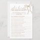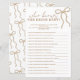 Gör din fest mer interaktiv med det här snygga pärlbågspelet "Vem vet bruden bäst", med ett delikat bågmotiv och elegant, feminint typsnitt för en mjuk och romantisk estetik. Perfekt för speltabeller, aktivitetsstationer och partynöjen, kompletterar denna design coquette-, klassiska och moderna bröllopsfesttema vackert. Den tidlösa pärlbågsstilen koordinerar sömlöst med matchande inbjudningar, skyltar och dekorationer för att skapa en sammanhängande och minnesvärd upplevelse för bruden att vara.