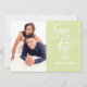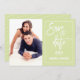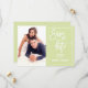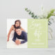 Bröllop spara datum-fotokort med kursivt handskriftsskript och trendig färg-schema-anpassade till dina händelsespecifikationer. Exempelbilden har använts med behörighet.